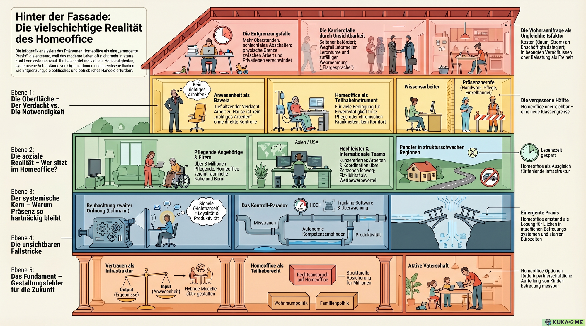 Homeoffice löst Probleme, die es selbst nicht erzeugt hat. Es kompensiert, was Betreuungssysteme nicht leisten. Es ermöglicht Erwerbsarbeit trotz Gesundheitseinschränkungen. Es überbrückt geographische Distanzen, die der Wohnungsmarkt produziert hat.